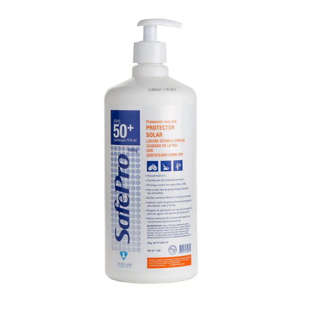 El Protector Solar Safepro FPS 50 es una mezcla cuidadosa formulada para proteger, nutrir e hidratar la piel de los dañinos rayos del sol. Con un peso específico de 0,90-1,10, pH de 6,0-7,5 y durabilidad de 24 meses, es seguro de usar y no peligroso. Se debe aplicar homogéneamente cada 2 horas, especialmente después de sumergirse en agua o sudar. Apto para niños mayores de 2 años, no se recomienda para menores de 6 meses. Almacénalo en un lugar fresco, seco y lejos del calor, manteniéndolo en su envase original con una vida útil de 2 años. La fecha de vencimiento está indicada en el envase.