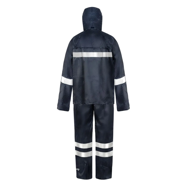 Traje de dos piezas, azul, impermeable, confeccionado 100% en tela de PVC. Generalmente usado en cualquier industria cuyas faenas se desarrollen en el exterior, en ambientes lluviosos (pesqueras, agricultura, manufacturas, construcción, entre otras).Ajustable en puños y tobillos. Aplicación de cintas reflectantes en pecho y espalda. Ventilación en espalda y bajo los brazos. Pouch con cierre para guardar. Incluye bolsa de almacenamiento y transporte.
